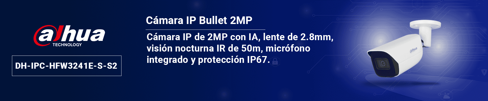DAHUA IPC-HFW3241E-S-S2 - Cámara IP Bullet de 2 MP/ WizSense/ Con IA/ Lente de 2.8 mm/ 107° de Apertura/ Micrófono integrado/ IR de 50 m / SMD 4.0 / AI SSA / Quick Pick/ Ranura MicroSD/ WDR Real de 120 dB / PoE / IP67 /